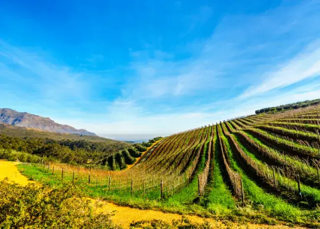 The vineyards are positioned primarily on cooler south to southeast facing slopes, at an altitude ranging from 650 to 850 feet above sea level. Cooling afternoon breezes from False Bay provide natural air conditioning for the vineyards during the warm summer months, cooling the temperatures by an average 18+ degrees. The vineyards were converted to organic farming practices in 2014.