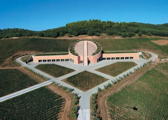 The gravity flow winery was designed by celebrated Swiss architect Mario Botta. The property encompasses 300 hectares, whose vineyards and climate are influenced by the nearby Tyrrhenian Sea. Its soils are comprised of Tufo (volcanic stone), and clay in the hilltops and calcareous alluvial in the lower sites. Attilio Scienza is in charge of the viticulture. Each vineyard site is farmed with total respect for sustainability. Vittorio and Francesca Moretti are also the father and daughter team behind the Petra winery. They were largely involved in architect Mario Botta's project. It was clear from the start that the winery was going to be built with the prefab building parts the Moretti family had made their success with. Also, an idea of Vittorio Moretti was the long, slightly theatrical tunnel dug into the hill, serving as a natural wine cellar lined up with barriques.