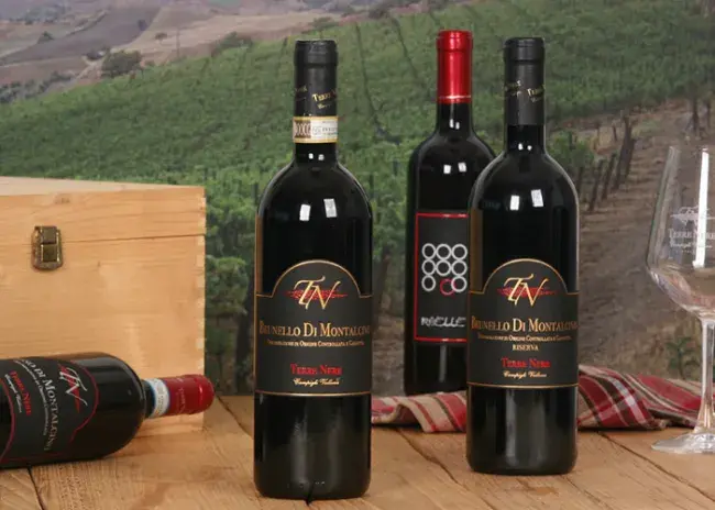 The Terre Nere estate stretches over 15 ha (37 acres) of property, at an elevation of 280 meters, south south-east, 10 km from Montalcino. 10 ha (25 acres) are planted in vines, in the hamlet of Castelnuovo dell’Abate, on the slopes leading up to the hilltop Castle of Velona. The vineyards are nestled in a setting of rare beauty, surrounded by pristine forests and a microclimate ideal for the cultivation of the vine. All the vineyards are in hilly areas and enjoy excellent sun exposure while being embraced by a constantly blowing breeze provided by Monte Amiata and Monte Nero. The special dark soil gives the winery its name “Terre Nere”.